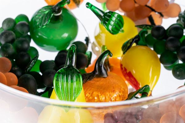 With 8 fruits in polychrome glass, 8 grape branches in frosted glass and a branch in green stones. Total 18 pieces.