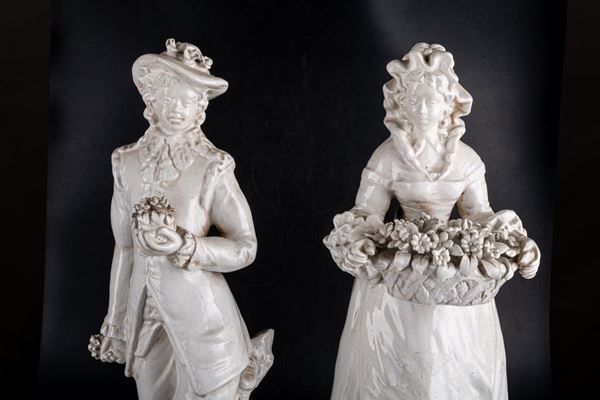 Sculptures in volume in white ceramic, with eighteenth-century clothes, with a bouquet of flowers in the hands. Left and right arms of the girl restored.