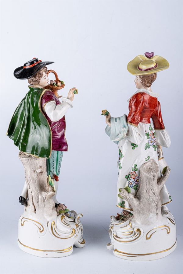 Volume sculptures in polychrome porcelain on a Rocaille base. "N" mark crowned under enamel at the base