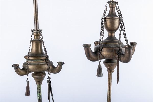 in brass, one with 4 lights (63 x 16 cm at the base), the other with 3 lights (49 x 12 cm at the base)