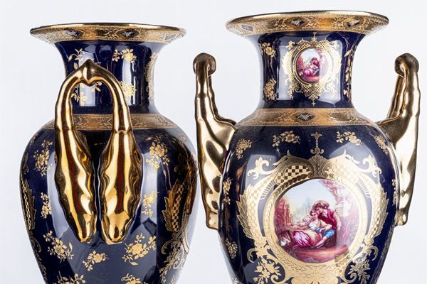 baluster-shaped, in blue porcelain with genre scenes within reserves, floral elements in pure gold on the base, body and neck. Circular support base with 4 comma feet, arched handles in pure gold.