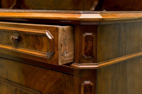 Two bodies, base with two doors and a drawer, flared corners, onion-shaped feet. Raised with one shelf, with tabernacle back and plume sides. Front and squared sides.