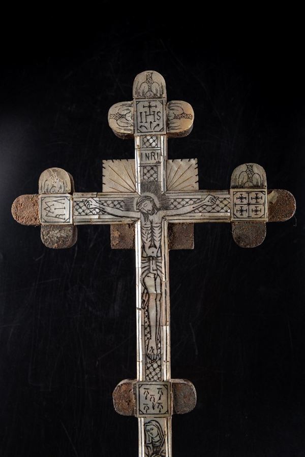 in brown patina wood and mother of pearl, sculpture in shape. Truncated cone-shaped base, with an effigy of St. Francis and, along the body of the cross, a representation of the Virgin at the base. Small parts of mother-of-pearl missing.