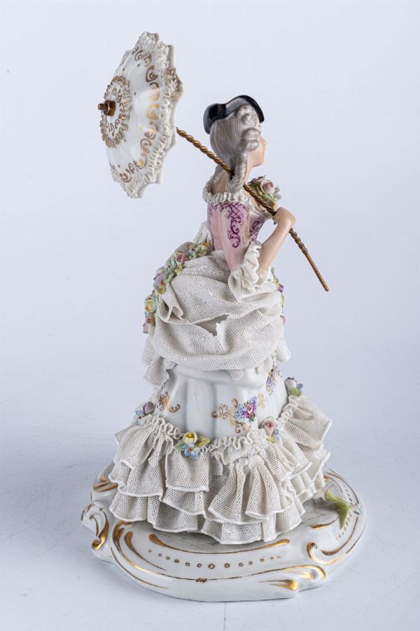 Volume sculpture in white porcelain with painted and relief floral decorations, pure gold finishes. Small shortcomings to the dress. Signed at the base "N" crowned in blue under enamel.