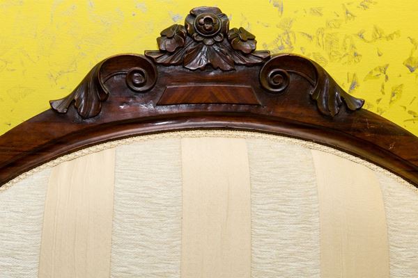 in mahogany, with 3 seats. Wavy front with beige velvet and silk upholstery, with sculpted and engraved floral elements.