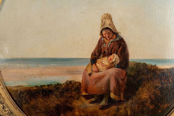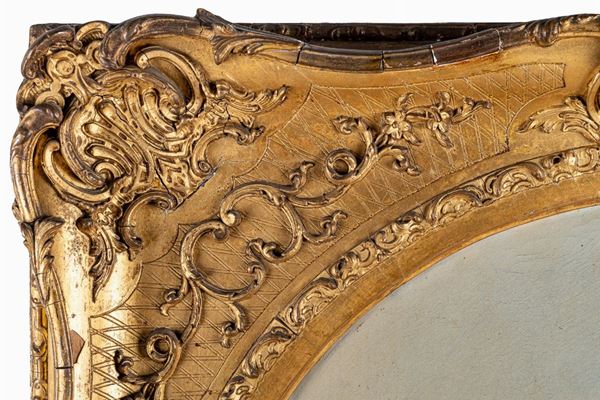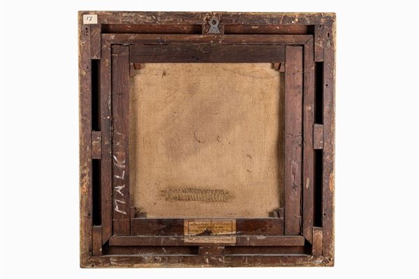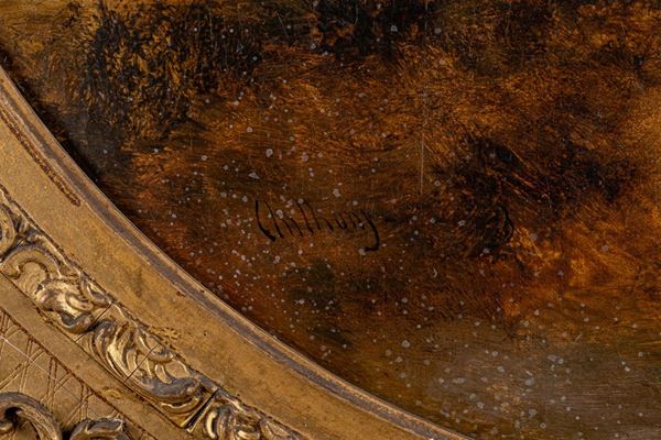 The painting is in a round arrangement and signed "Anthony" on the lower left. Framed, canvas and frame show the label of the framer Henry Cooke of Birmingham.