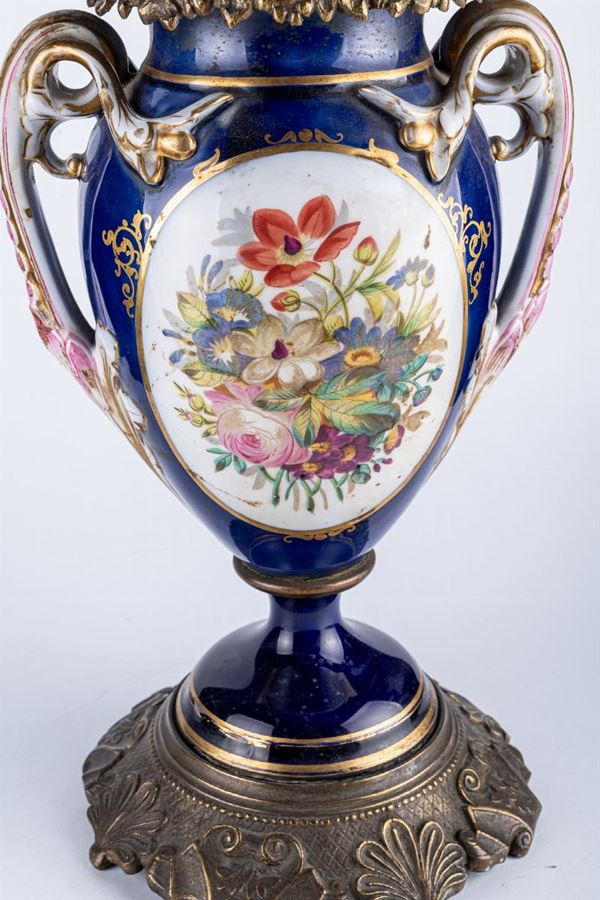 electrified in blue porcelain, with genre scenes and flowers within gilded reserves. Bow handles, pure gold finishes, bronze bases and trimmings. Missing glass boule.