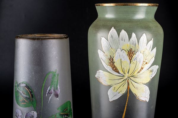 In frosted glass, with floral relief decoration and gold edging. Worn parts.