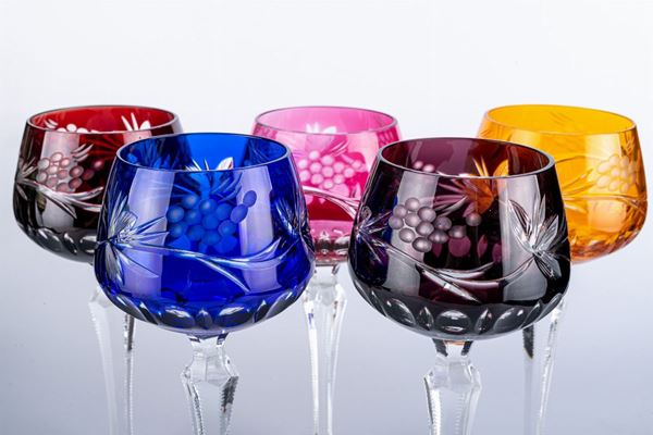 In polychrome counter-cut crystal, hexagonal stem body with glass cup in counter-cut crystal with plant motifs, in red, orange and blue colors.