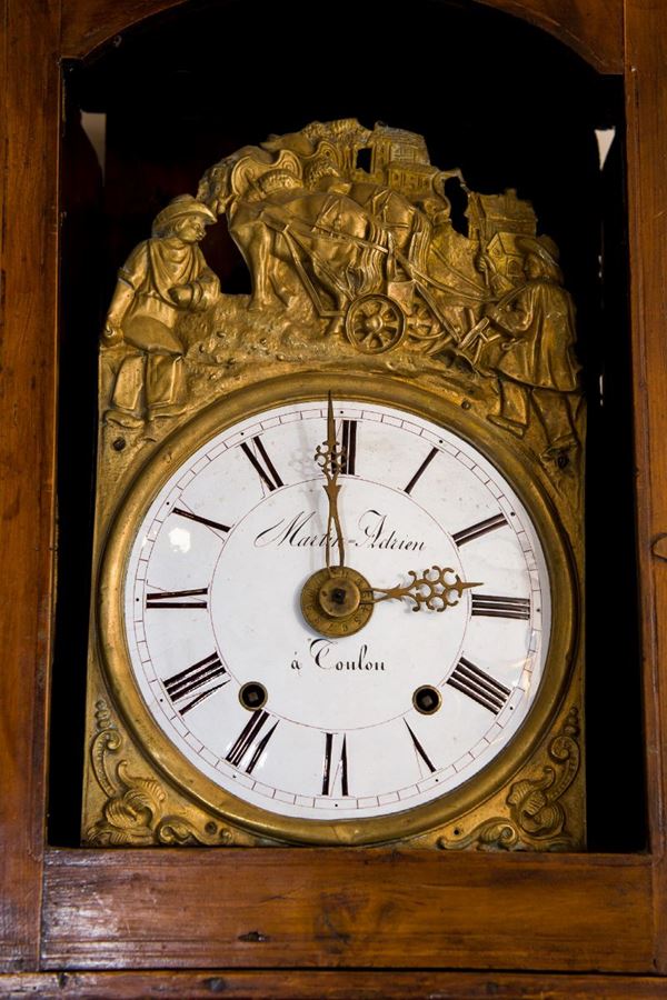 with brown patina poplar wood case, glass missing upper part, part painted with geometric motifs, with pendulum mechanism, white enamelled branch dial, with Roman numerals. Embossed brass sheet, engraved with a bucolic scene, marked "Martin Andrien".