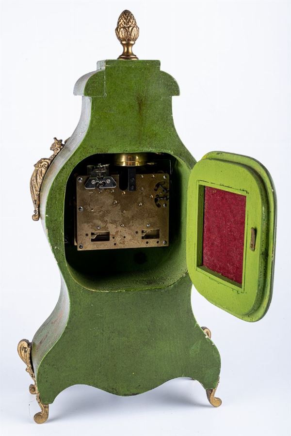 In Baroque style, wooden case in green lacquer, with floral decorations and a glimpse of the oil landscape on the front. Bronze cranksets, white dial with Roman numerals. Manual winding watch, not in working order