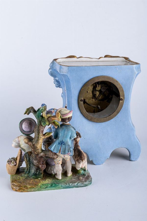 In polychrome porcelain, with a rectangular body, decorated with vine shoots and leaves, surmounted by a genre scene in polychrome porcelain, with children and animals, pure gold finishes. Brocot clock machine, with white Roman numeral dial and double winding key (hours and striking). Stamped "Rollin Paris". Missing pendulum and lack on genre scene.