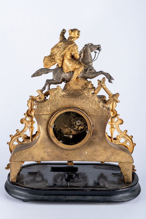 In gilded metal, Rocaille shape, surmounted by a knight with lance. Clock with white dial with Arabic numerals. Small shortcomings.