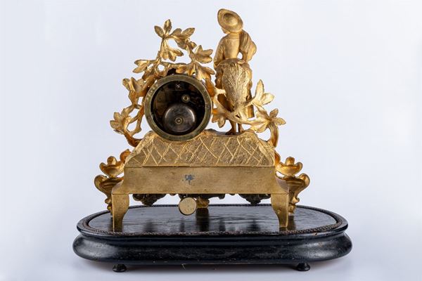 In gilded metal, Baroque shape, with a female character, plant elements and perforated parts as decoration. Clock with white dial and double numbering with Roman and Arabic numerals, with holes for winding the hours and ringtones. On wooden base and glass dome. Crack to the glass bell.