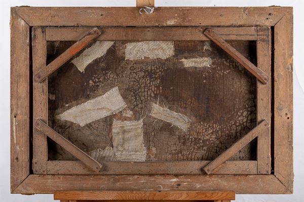 The painting, on the first canvas, has some patches on the back. Repaintings are visible in the upper part of the sky. Presence of a small tear in the upper part of the painting. In a coeval frame.