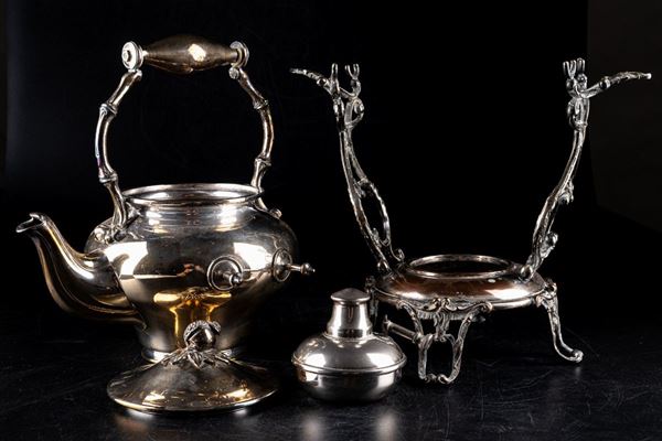 In silver metal, Rocaille shape, complete with stove. Parts worked, engraved and in relief, with ivory inserts. Total pieces: 3. Fratelli Broggi manufacture.