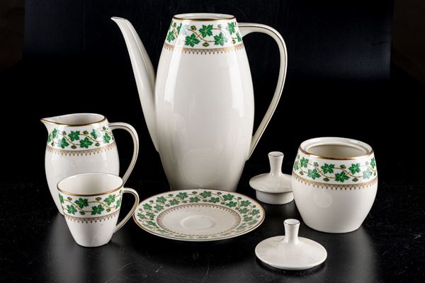 in white porcelain, with green floral decoration and pure gold finishes, consisting of 8 cups with saucers, coffee pot, milk jug and sugar bowl.