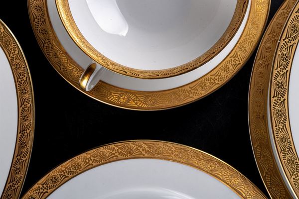 In white porcelain with engraved pure gold profile. Consisting of: 8 flat bowls, 8 deep bowls, 8 small bowls, 1 bowl with lid, 1 tray with a high edge, 2 serving trays and 6 consommé cups with plates. Rosenthal manufacture. Total pieces: 40.
