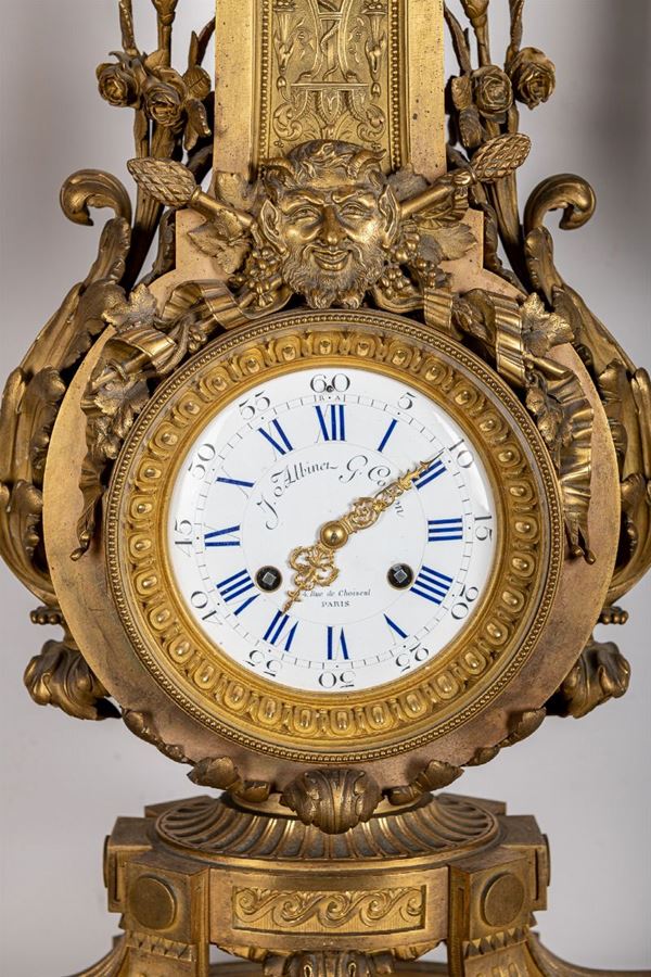 composed of a support clock and a pair of electrified candlesticks with 7 lights, in gilded bronze. Onion shaped clock with oval base with four ferine support feet and elongated body ending with an urn. Pendulum machine, white dial with Roman numerals and holes for loading the hours and the alarm. Embossed and engraved decorations with floral and mask motifs. Measurements: 80 x 42 x 23 cm The candlesticks follow the shape and decorations of the clock. Measurements: 75 x 41 x 28 cm