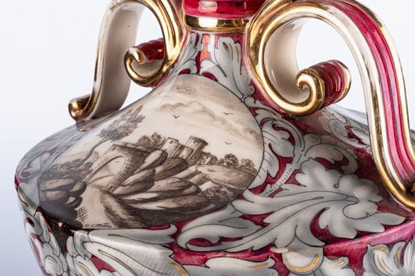 In ceramic, with urn body, ribbon handle, polylobed edge, disc foot. Decorated with leaves and plant shoots and landscape scenes on a white background. Finishes in pure gold. Slight wear to the gilding.