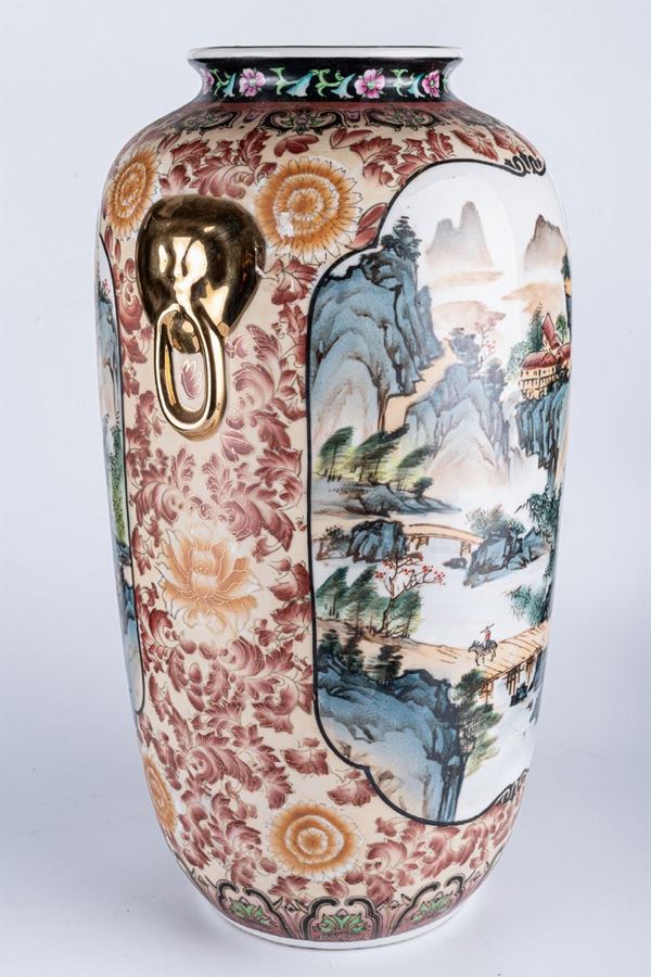 in polychrome porcelain, with genre landscape scenes within reserves. Handles in pure gold.