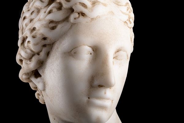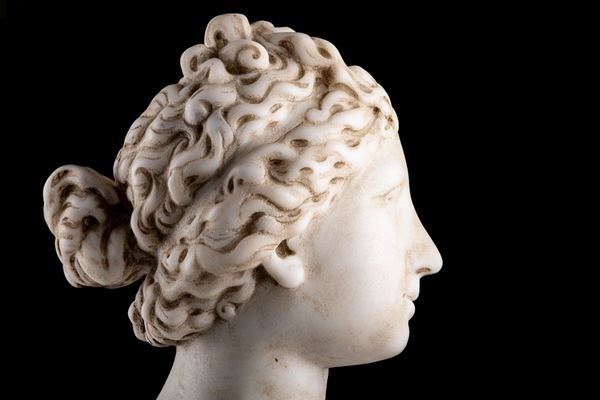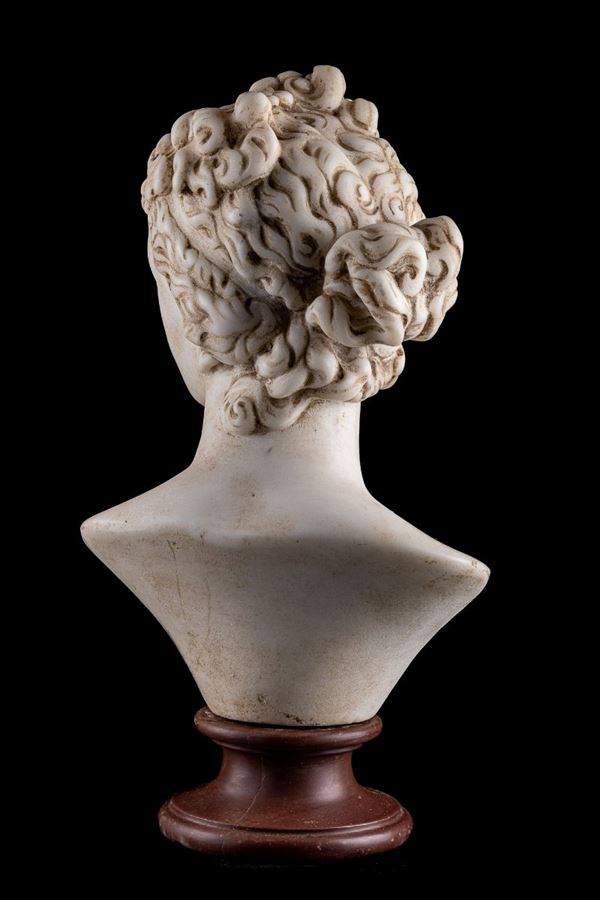 Sculpture in volume in Carrara statuary marble on an antique red marble base.