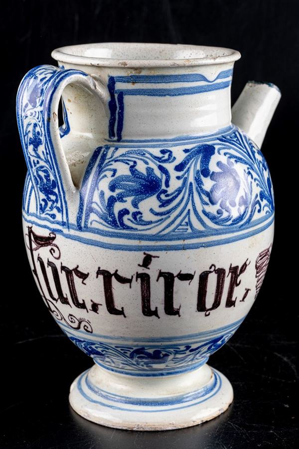 in white ceramic with decoration on the body and at the base in floral cobalt blue. Body with white reserve with spice name in manganese. Ribbon handle, peripheral body with disc foot and cylindrical beak. Small shortcomings.