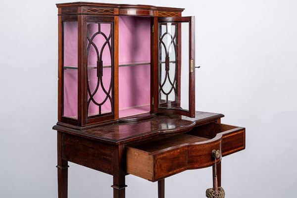 Two-body, mahogany. Base with four truncated conical plinth legs, connected to the base, with a drawer in the band under the top. Stand with 3 glass compartments and opening central door, with a shelf inside and side and front windows partially trimmed in wood. Geometric finishes, on base and riser, in fruit wood.