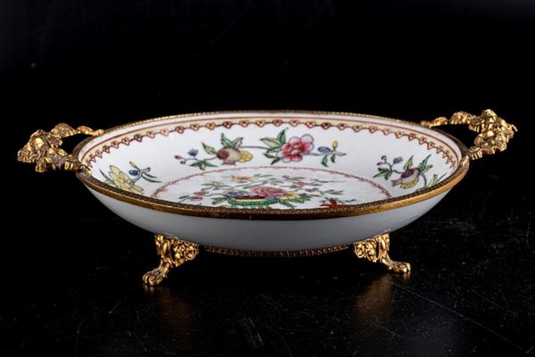 with floral peony decoration, gilt bronze trimmings, handles and feet.