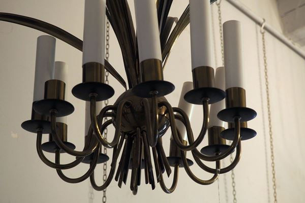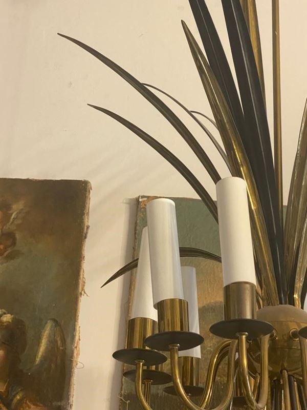 with 12 lights, in brass. Canulae in white frosted glass, with decorative elements in leaves and ribbon. Missing parts.
