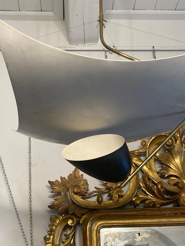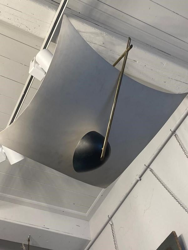 one light suspension chandelier with brass structure and black lacquered aluminum diffuser.