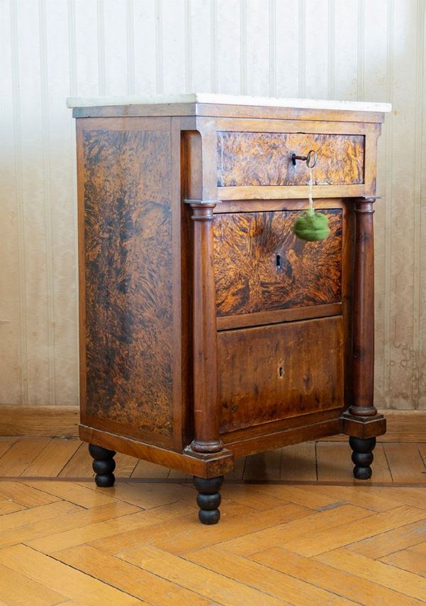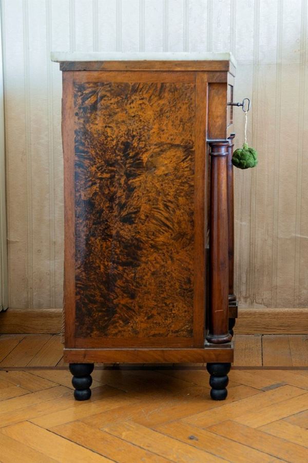 in wood veneered in thuja briar, with 3 drawers, overlapping onion feet and side columns. White marble top. The object can only be viewed in the photo and must be collected directly from the owner's house, by appointment (Rome)