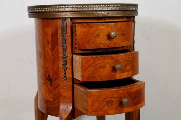 with 3 drawers and shelf, with saber legs. Bronze finishes and fruit wood inlays on ebony plating.