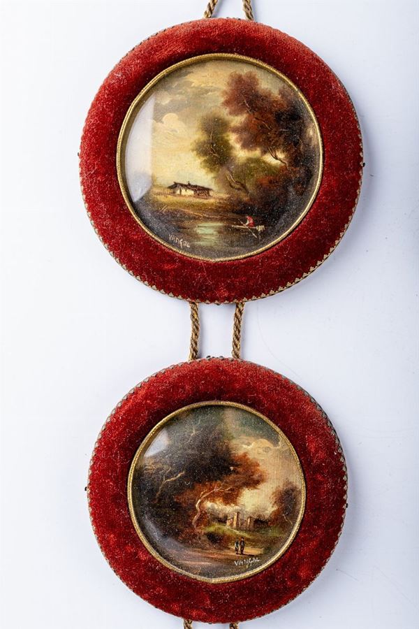 with 6 landscapes, oil paintings on canvas, in a circular arrangement, of different sizes and subjects.
