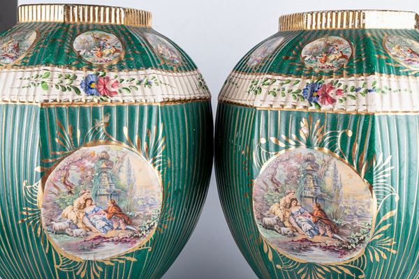 In green-finished ceramic, with genre scene decorations within gilded reserves. Ribbed octagonal urn body.