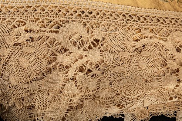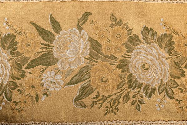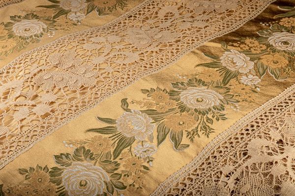 and gold silk brocade with floral embroidery, trimmed with crochet cotton lace.