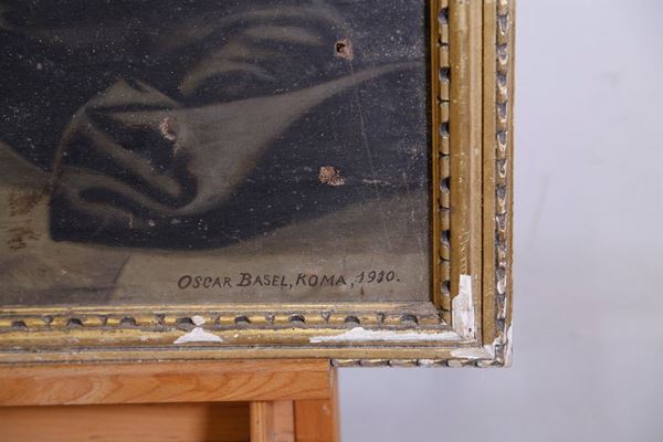 The painting, signed "Oscar Basel, Rome, 1910" in the lower right, has numerous gaps and tears in the canvas. Framed.