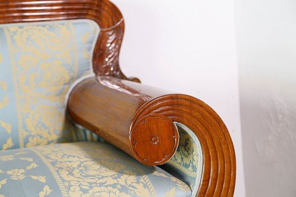 in mahogany, with plinth legs, high back with band motif, shell-shaped armrests and fascia under the demi-moon seat. Light blue silk upholstery with golden floral motifs