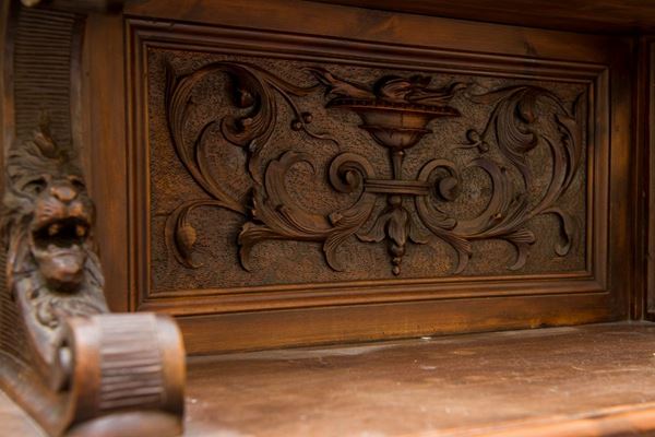With 4 shelves in carved beech wood and with plant motifs in relief, with twisted columns, dragon heads. Throwing front and angular sides. Small lack of a frame. The object can be viewed only in photos and must be collected directly from the owner's house, by appointment (Rome)