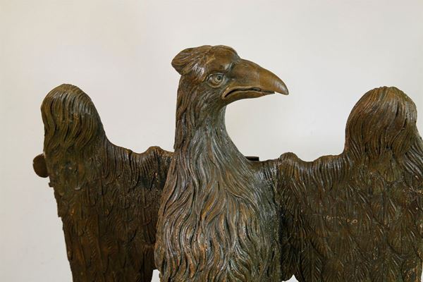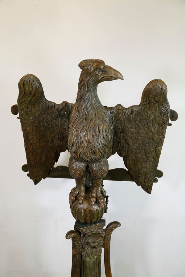 Large carved wooden lectern with traces of polychrome, composed of a central fluted baluster supported by three arched volutes, surmounted by a sphere that supports a large eagle with spread wings that conceal the book holder. It has defects and shortcomings.