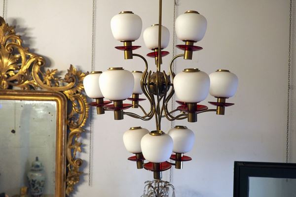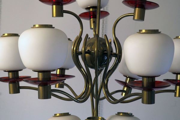 with 12 lights, with brass arms, glass bowls and red glass saucers, "Stilnovo" style.