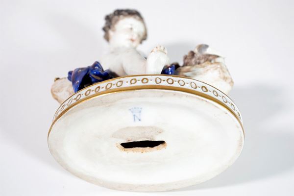 in porcelain, representing "Putto" (15 x 12 x 9 cm) and "Young lute player" (25 x 14 cm) on a bronze base. "N" mark crowned at the base