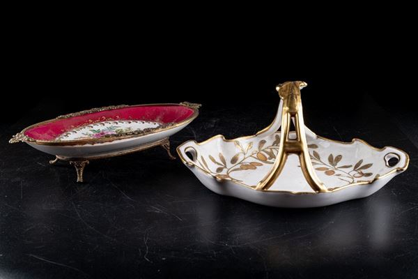 Made of porcelain. One in a basket shape with ribbon handle, polylobed edge, with leaf and fruit decorations in pure gold (12 x 27 x 20 cm). The other valet tray is a tub, in red color, with a bouquet of flowers on a white background within a golden reserve. Crankset and feet in bronze (6.5 x 28 x 15 cm)