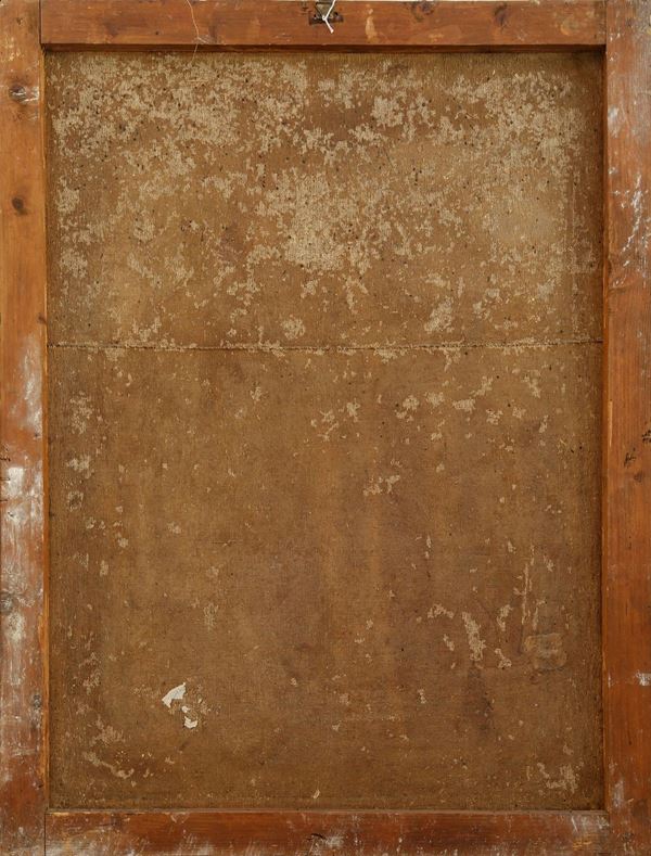 The painting is presented on the first canvas and without visible repainting with Wood's lamp. The state of conservation as a whole appears to be good, despite the dense network of cracks present throughout the painting, together with the presence of small dark spots. On the back of the canvas the possible junction seam between two canvases is visible, corresponding, in the front part, to a wider horizontal crimp.