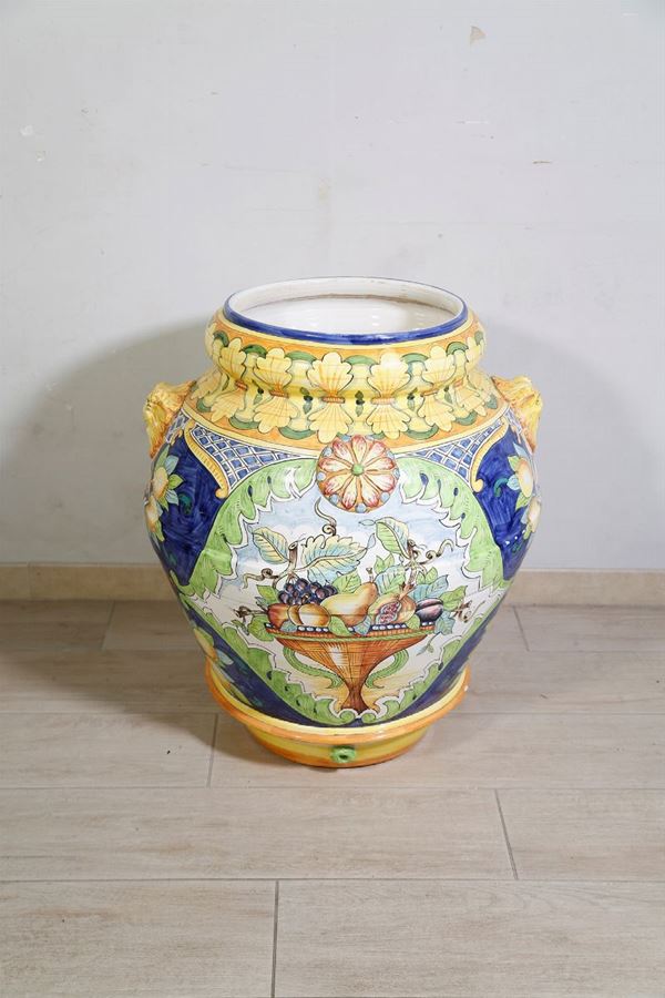 in ceramic, lion handles, bowl-shaped body and flower and fruit decoration within reserves. Small flaws