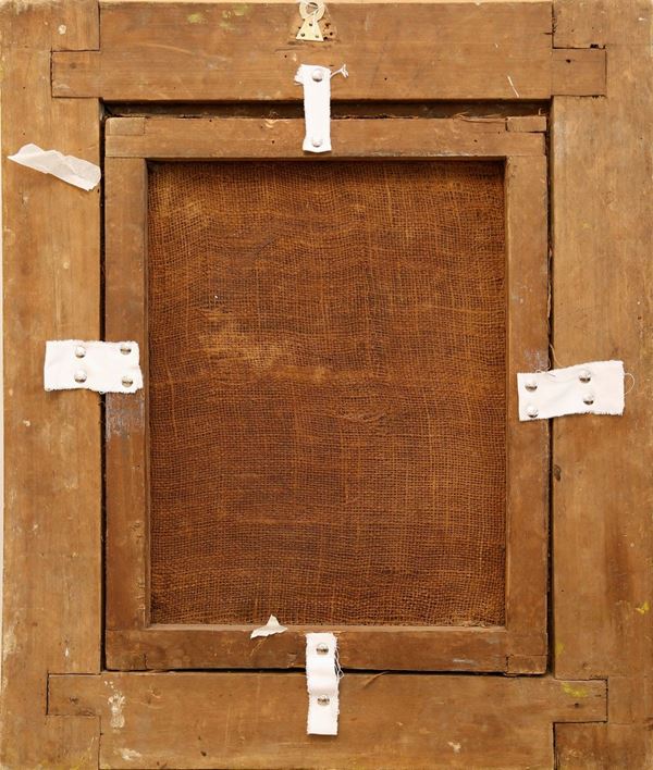 The painting has an ancient relining. No repainting is evident, except for three small compensations for falling material: two of them in the background and one on the cheek of the Saint. Framed.