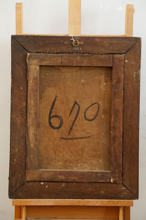 In lacquered and gilded frame with floral decoration. Old relining, with canvas reinforcement in the back. The restorations appear in three small areas of the clouds and on the left side of the marquee.