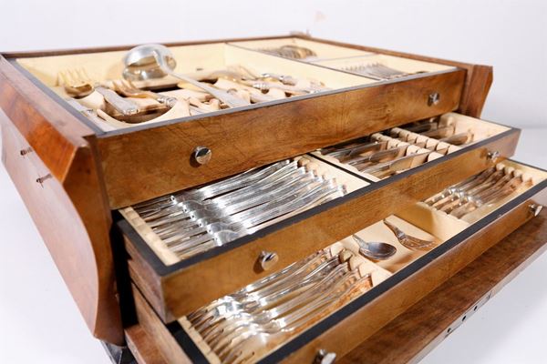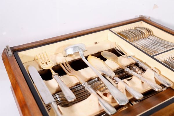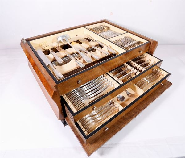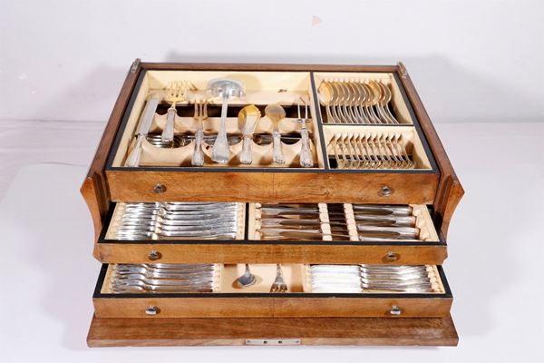 consisting of: 12 soup spoons, 12 coffee spoons, 24 table forks, 24 table knives, 12 fruit forks, 12 fish forks, 12 fish knives, 12 fruit knives, 1 ladle, 4 fish cutlery , 2 salad servers, 2 dessert cutlery with golden top and 2 meat cutlery. Net weight: 6370 gr; Gross weight: 3169 gr. Total weight: 9539 gr Within walnut wood box with 3 drawers, with interior lined in ivory velvet, with calatoia lid. Damage to the box lid.