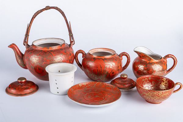 in porcelain with a red background, with gold decoration, 5 cups with saucers and 3 pieces in shape.