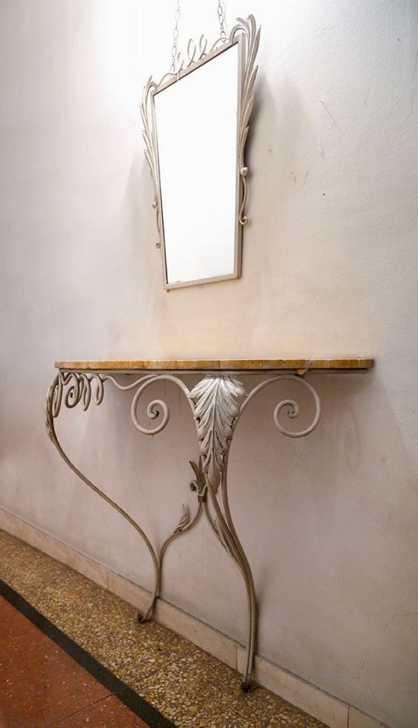 with wall mirror, in white lacquered wrought iron and demilune top in pink marble. Console dimensions: 96 x 133 x 41 cm; mirror dimensions: 70 x 57 cm. The object can only be viewed in the photo and must be collected directly from the owner's house, by appointment (Rome)